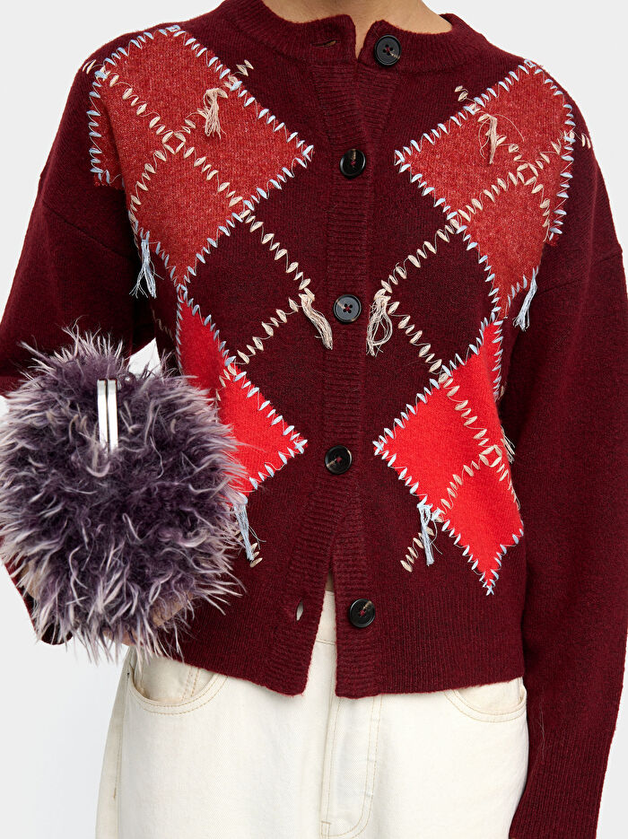 Elmas desenli örme hırka. Çapraz nakış. Yuvarlak yaka. Uzun kollu. Düğme kapama. Model 1,73 m boyunda ve XS-S beden giyiyor.