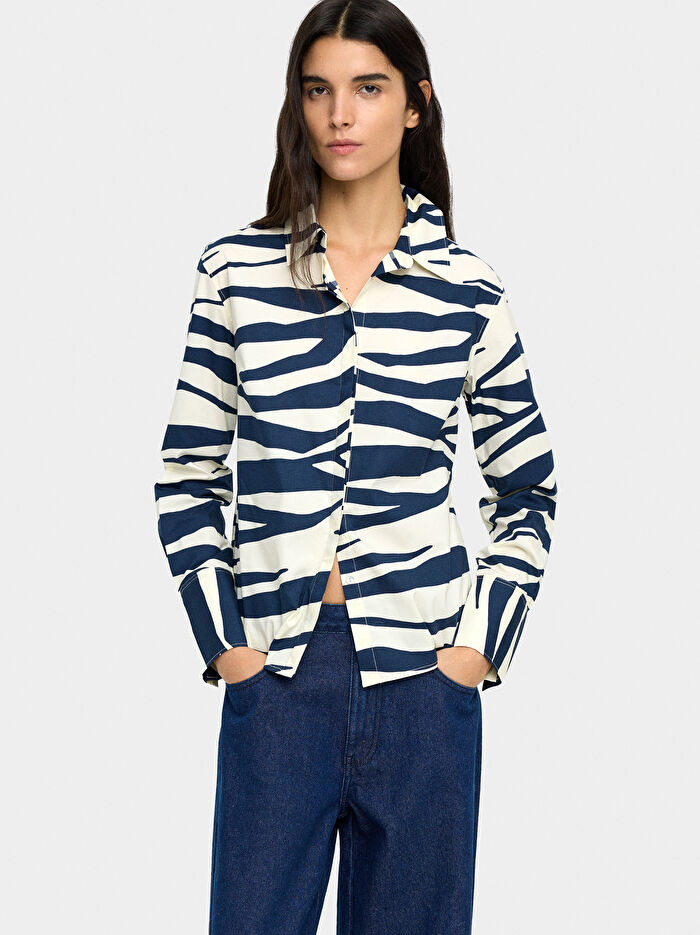 Hayvan desenli pamuklu gömlek. Uzun kollu; düğmeli manşetler. Gizli düğme kapamalı. Yuvarlak etek ucu. Model 1,78 m boyunda ve S beden giyiyor.