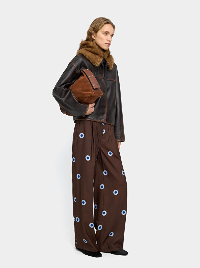Dairesel desenli, dökümlü pantolon. Düz kesim. Fermuarlı yırtmaç. Ön kısımda pileler. Yan cepler. Model 1,77 m boyunda ve S beden giyiyor.