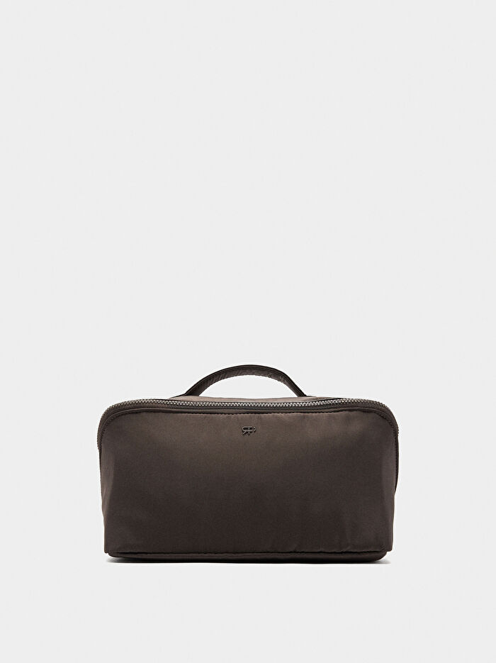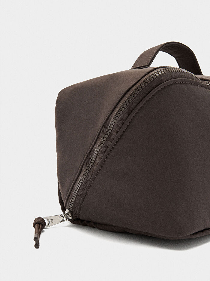 Sade teknik kumaş makyaj çantası. Kumaşın kesimine göre değişebilen desenli baskılı astar. Toplama için iç poşet. Orta bölme. İp ve düğüm detaylı fermuarlı kapatma. Sabit bileklik askısı.