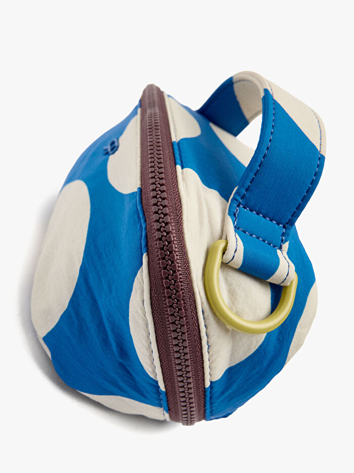 Baskılı puantiyeli teknik kumaş makyaj çantası. Kontrast renkte düz astar. Fermuarlı kapatmalı üç bölme. Kurdele detaylı fermuar ile ana kapatma. Sabit el askısı.