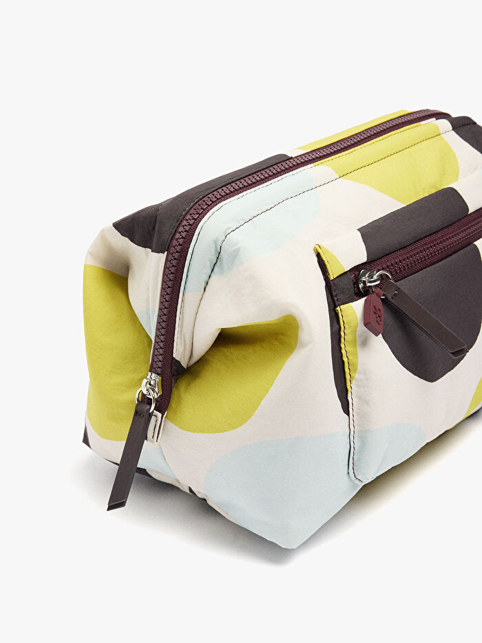 Desenli puantiyeli teknik kumaş makyaj çantası. Astar ve iç cep. Dış cep. Kurdele detaylı kontrast renk fermuarlar.