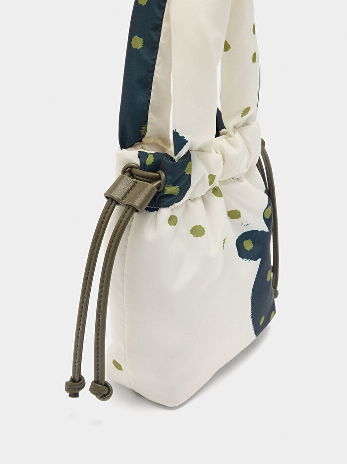 Orta boy desenli teknik kumaş telefon çantası. İç astar. İpli manyetik kapatma. Sabit el kayışları. Ayarlanabilir ve çıkarılabilir.