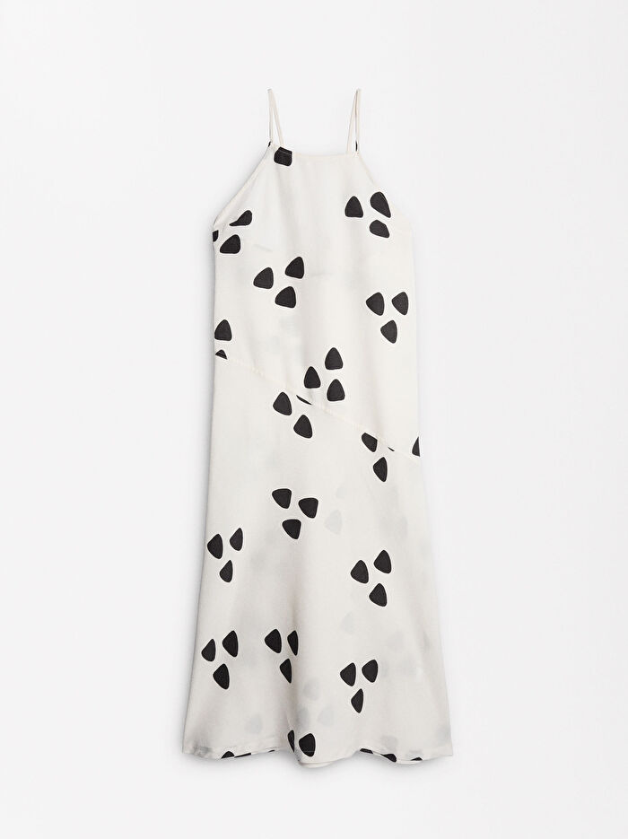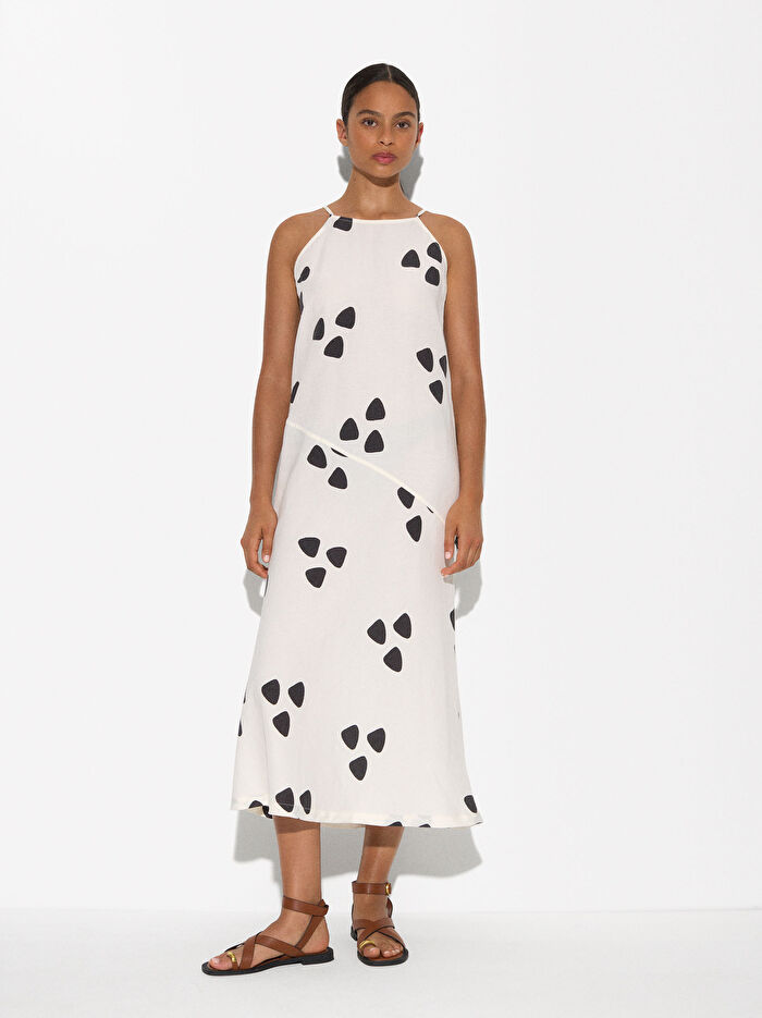 Ayarlanabilir askılı, desenli ve uzun keten elbise. Düz yaka. Sırt dekolte.