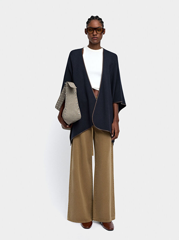 Kontrast dikiş detaylı örme panço. Tek beden olarak sunulan bu ürün, farklı vücut tiplerine uyum sağlayacak ve şekilde tasarlanmıştır. Model 1,80 m boyundadır.