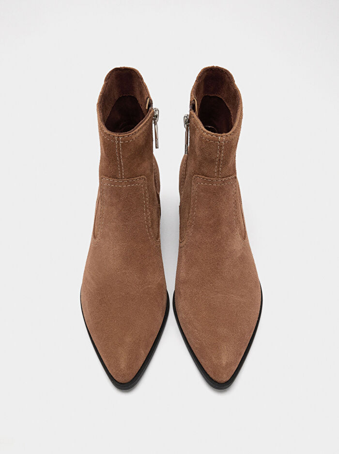 Geniş topuk deri bilekte bot. İşaretli dikiş. Astarlı. Fermuar kapatma. Sivri burunlu. Termoplastik poliüretan taban geniş topuk.