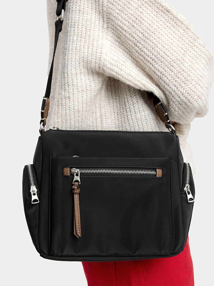 Astarlı ve iç cepli küçük teknik kumaş efektli çapraz askılı çanta. Ön kısımda, yanlarda ve arkada dış cepler. Fermuarlı. Ayarlanabilir ve çıkarılabilir çapraz askılı çanta askısı.