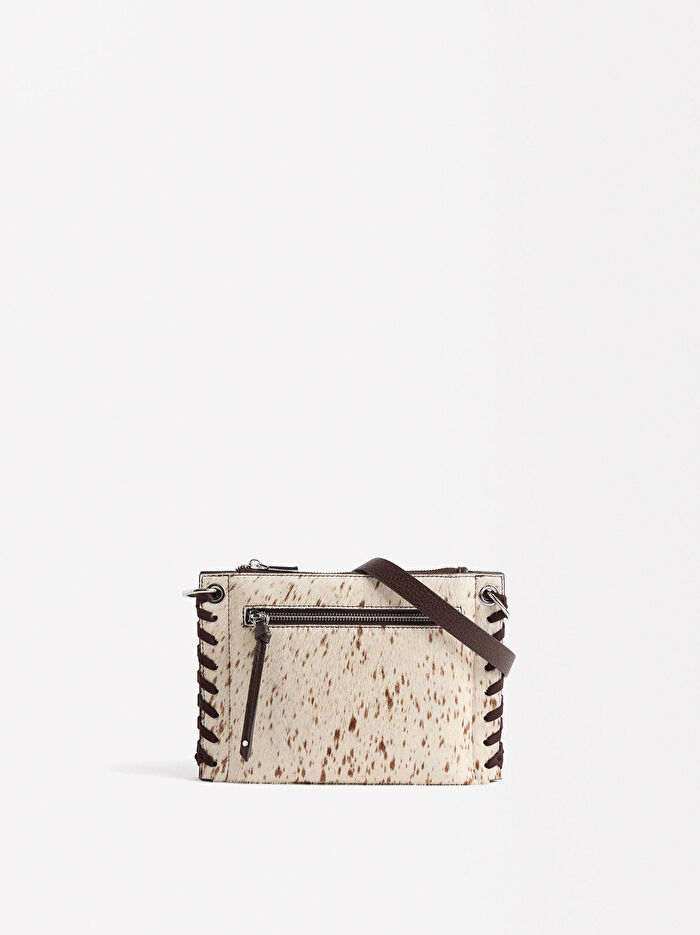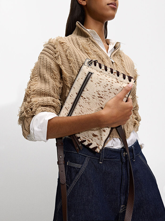 Dış cepli. deri çapraz askılı çanta. Kenarları örme detaylı. Fermuar kapatma. Astarlı ve iç cepli. Ayarlanabilir ve çıkarılabilir askılı.