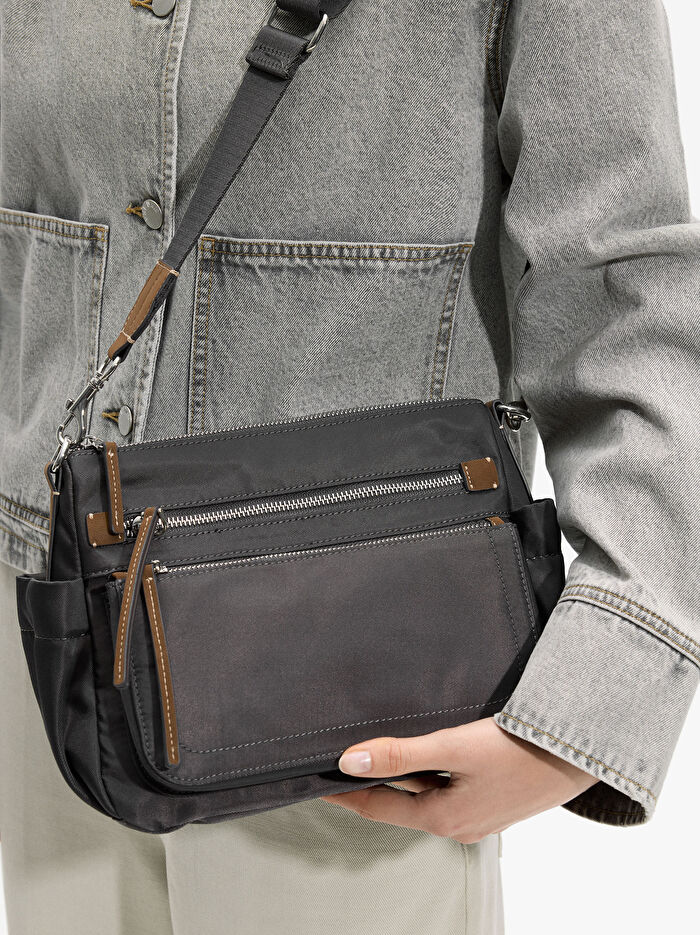 Ön, arka ve yanlarda dış cepleri olan teknik kumaş çapraz askılı çanta. Orta boy. Astar ve iç cep. Fermuarlı kapatma. Ayarlanabilir ve çıkarılabilir askı.