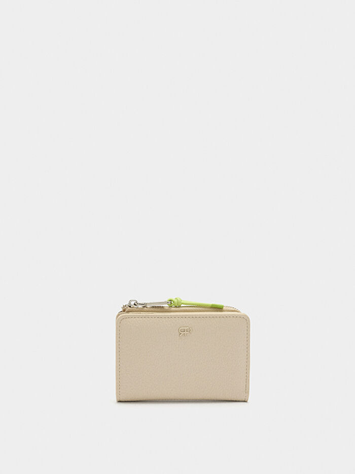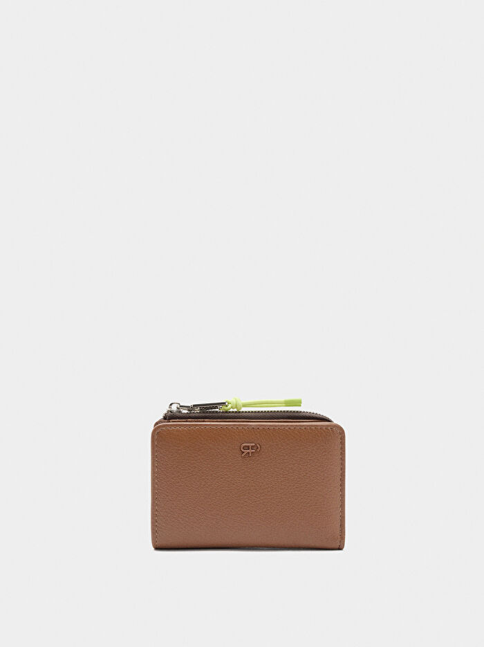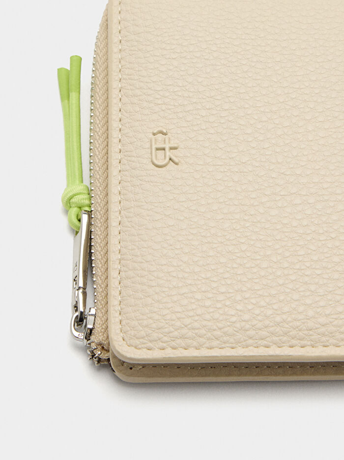 Dokulu basic cüzdan. Küçük boyutlu. Kart yuvaları ve kağıt para bölmesi; çıtçıtlı düğme kapama. Bozuk para bölmesi; kordon ve düğüm detaylı fermuar kapama.