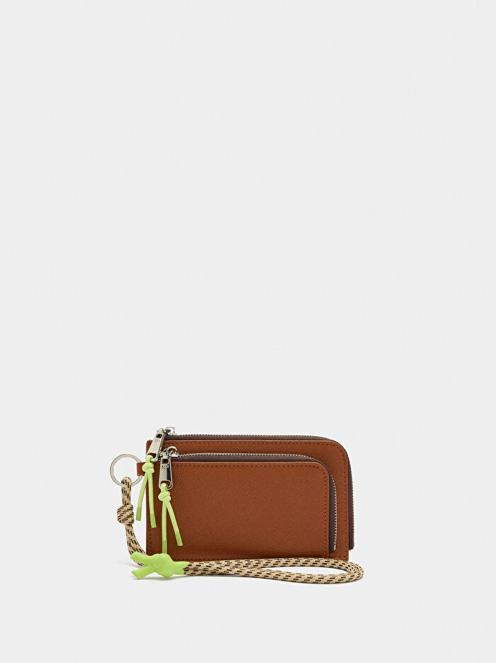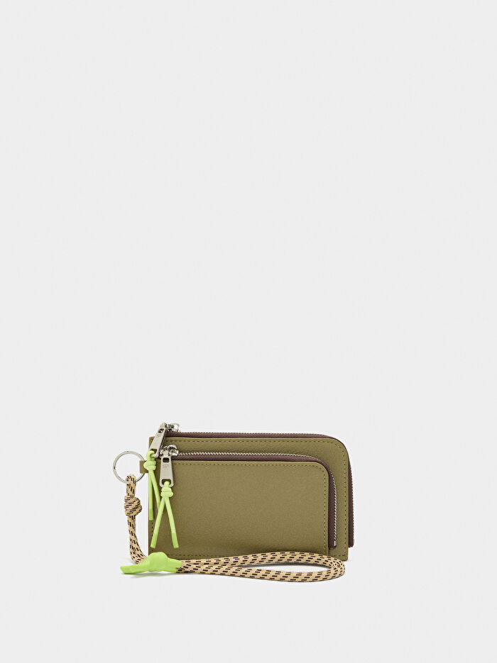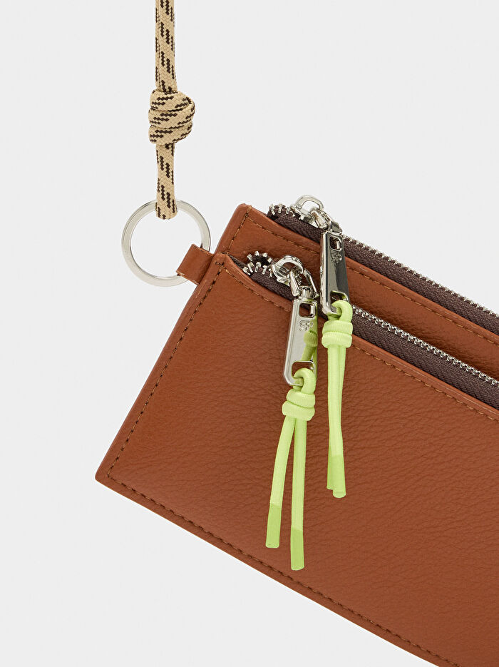 Dokulu çok amaçlı kese. İç astar ve şerit detaylı fermuarlı kapaklar. Bir tarafında ayarlanabilir ve çıkarılabilir kordon detayı.