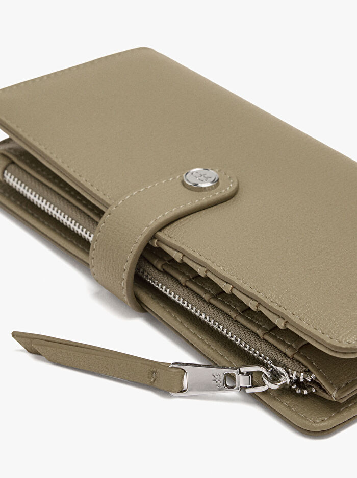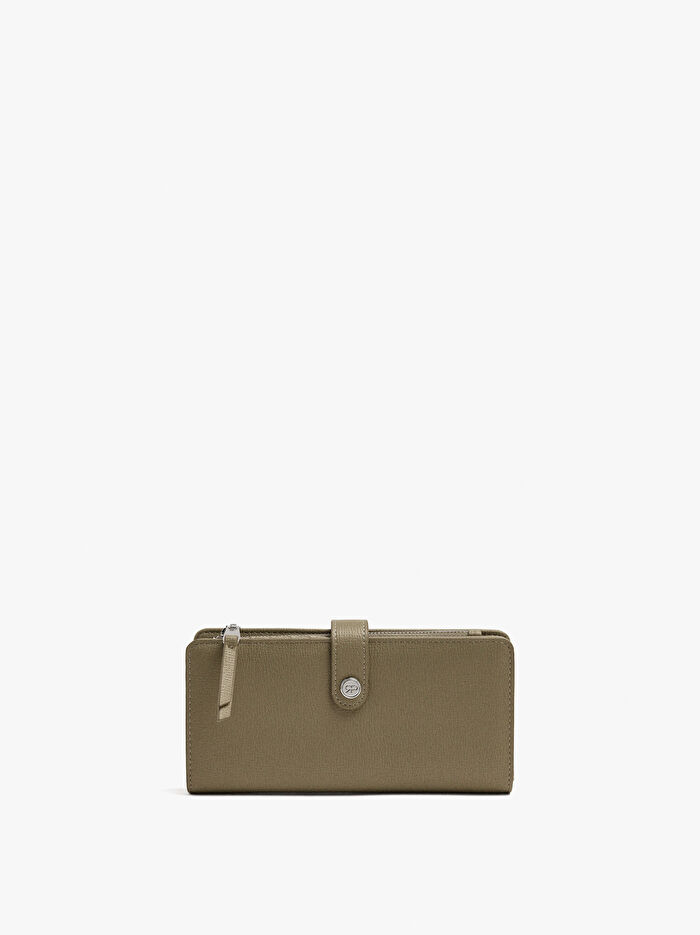 Dokulu büyük cüzdan. Çok sayıda kart yuvası ve kağıt para bölmesi. Fermuarlı orta bozuk para bölmesi. Kayışlı ve çıtçıtlı ana kapak.