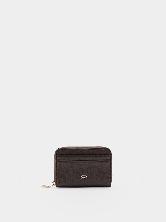 Dokulu küçük cüzdan. Kart yuvası. Bozuk para bölmesi. Fermuarlı kapak. Dış cepler.