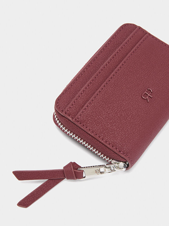 Dokulu küçük cüzdan. Kart yuvaları. Bozuk para bölmesi. Şerit detaylı fermuar kapatma. Dış kart yuvaları.
