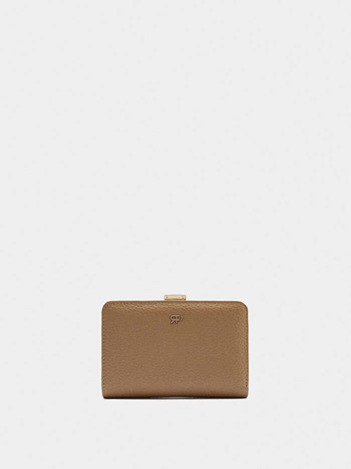 Dokulu orta boy cüzdan. Kart yuvalı ve banknot bölmeli kısım; kayış ve kopçalı kapama. Fermuarlı bozukluk bölmesi.