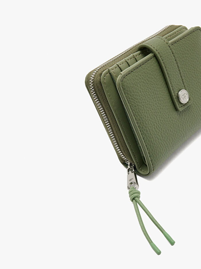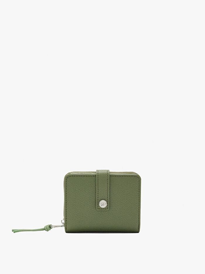 Dokulu küçük cüzdan. Kart yuvaları ve kağıt para bölmeleri. Çıtçıtlı düğme kapama. Fermuarlı bozuk para bölmesi.