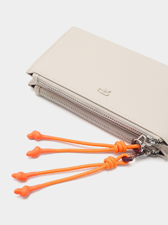 Dokulu cüzdan. Orta boy. Kart yuvaları ve kağıt para bölmeleri. Fermuarlı bozuk para bölmeleri; kordon detayları. Çıtçıtlı ana kapak.