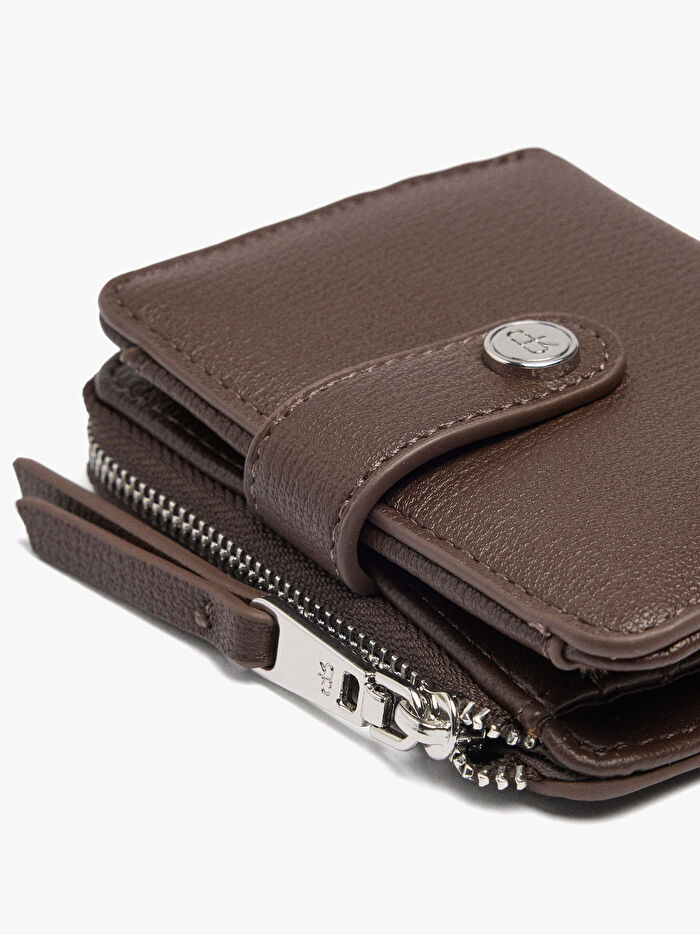 Dokulu küçük cüzdan. Çok sayıda kart yuvası ve kağıt para bölmesi. Fermuarlı bozuk para bölmesi. Kayışlı ve çıtçıtlı ana kapama.