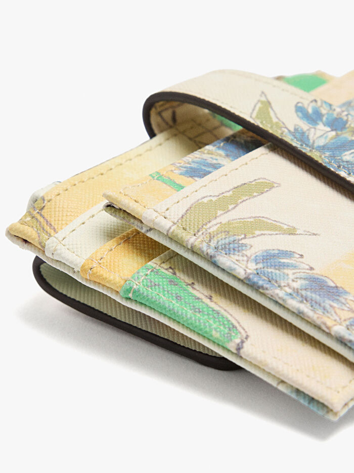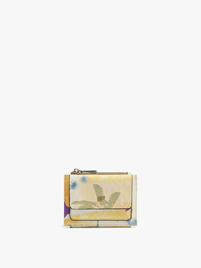 Dokulu baskılı kartlık. Orta boy. Birden fazla kart yuvası. Fermuarlı bölme. Kapaklı dış cep.