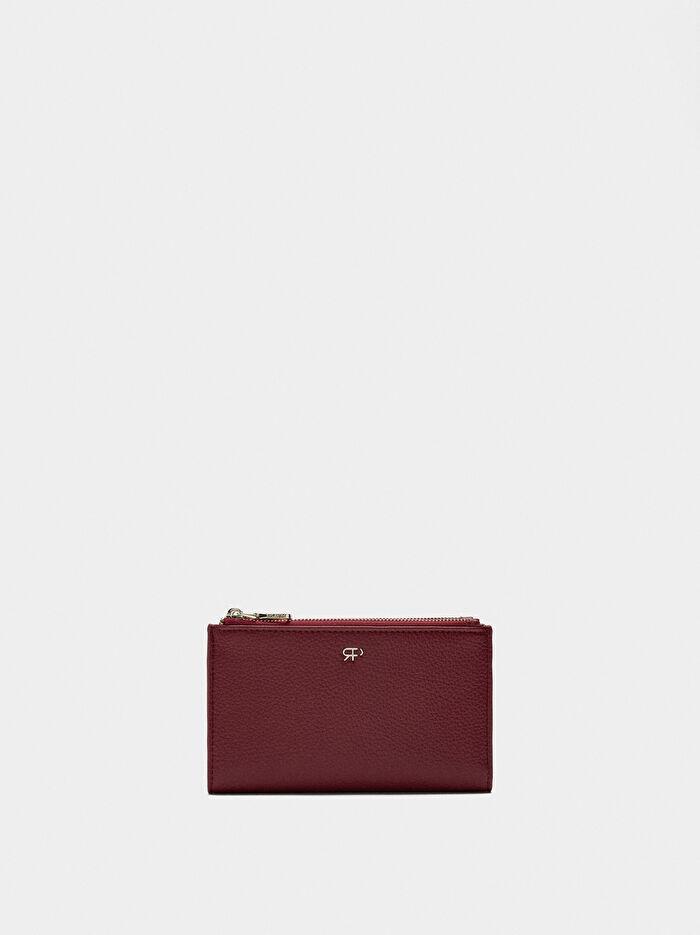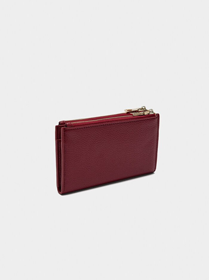 Dokulu cüzdan. Orta boy. Kart ve kağıt para gözleri. Fermuarlı ikili bozuk para bölmesi. Düğmeli ana bölme.