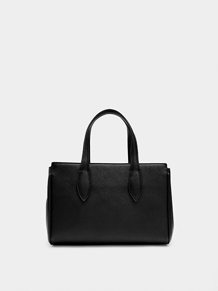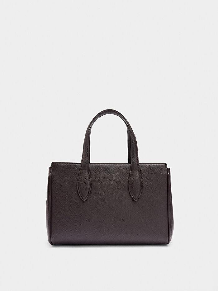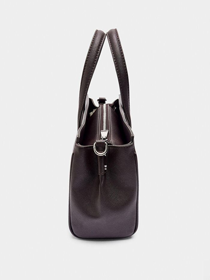Dokulu tote çanta. Orta boy. İç bölmeler; biri fermuarlı. İç astar. Fermuarlı ana açıklık. Sabit el sapları. Ayarlanabilir ve çıkarılabilir çapraz askı.