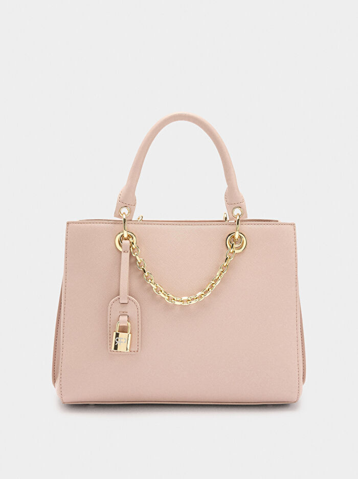 Dokulu orta boy tote çanta. Astar ve iç cep. Fermuarlı orta bölme ve yan bölmeler. Manyetik kapamalı ana kapak. Sabit el sapları. Zincir bağlantı detayı ve çıkarılabilir charm.