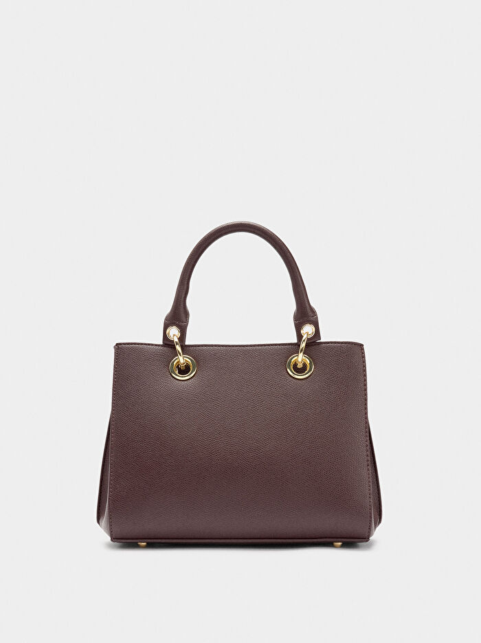 Dokulu küçük tote çanta. Astar ve iç cep. Fermuarlı orta bölme ve yan bölmeler. Manyetik kapamalı ana kapak. Sabit el sapları. Ayarlanabilir ve çıkarılabilir çapraz askı dahil.
