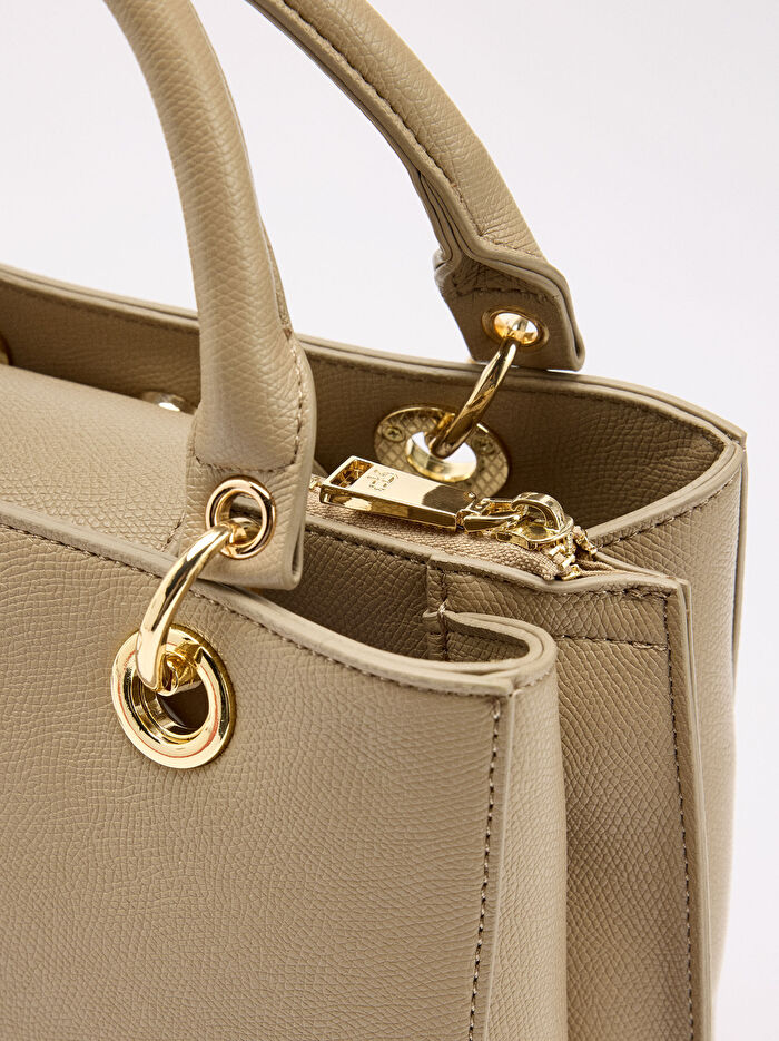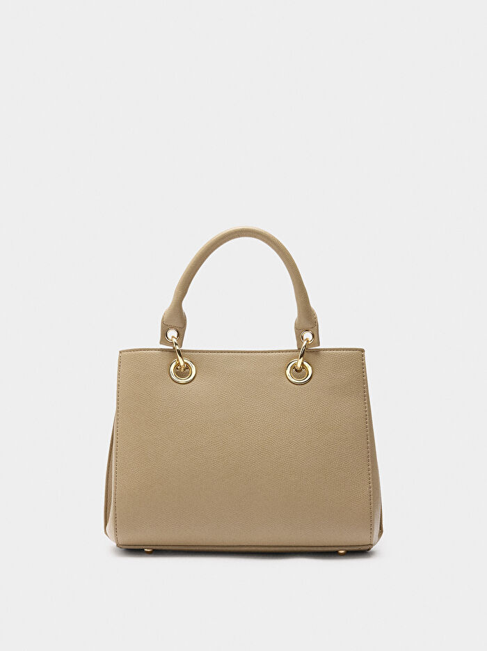 Dokulu küçük tote çanta. Astar ve iç cep. Fermuarlı orta bölme ve yan bölmeler. Manyetik kapamalı ana kapak. Sabit el sapları. Ayarlanabilir ve çıkarılabilir çapraz askı dahil.
