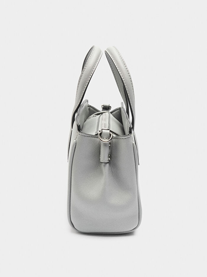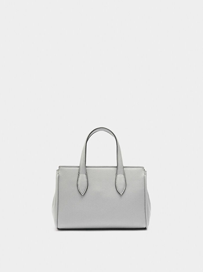 Dokulu küçük tote çanta. İç bölmeler; biri fermuarlı. İç astar. Fermuarlı ana açıklık. Sabit el sapları. Ayarlanabilir ve çıkarılabilir çapraz askı.