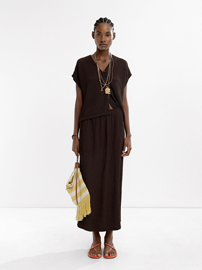 Dokulu uzun etek. Beli lastikli. Hafif kloş kesim. Model 1.80 boyunda ve S beden giyiyor.