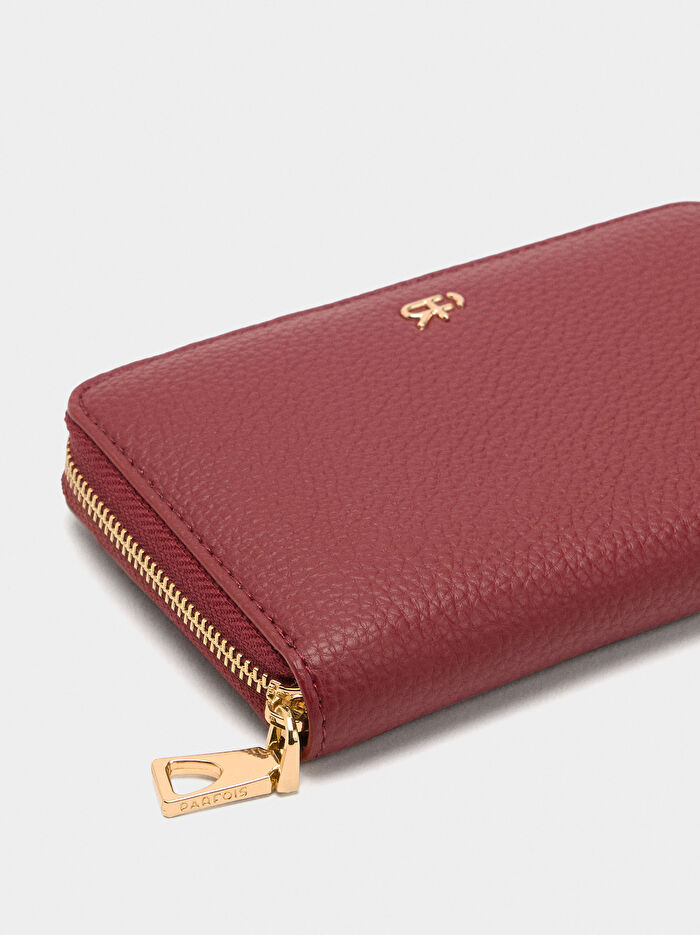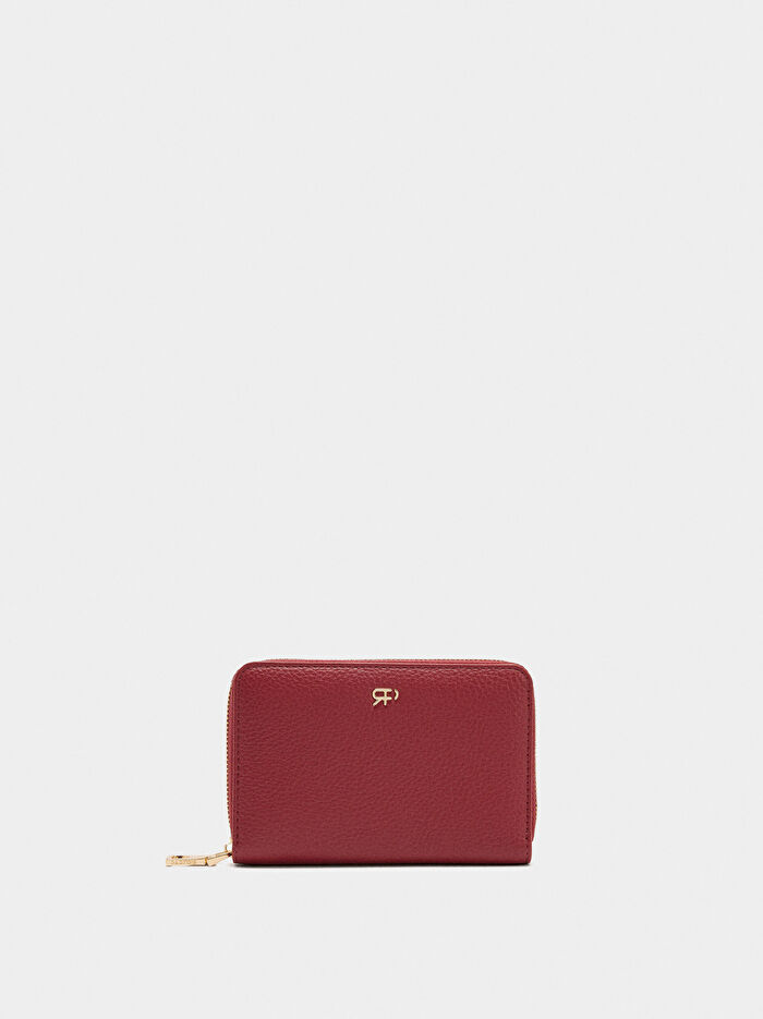 Dokulu orta boy cüzdan. Kart yuvaları. Bozukluk bölmesi. Fermuarlı kapatma. Dış yuva.