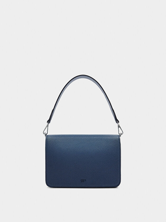 Dokulu, yapısal çapraz askılı çanta. Orta boy. Manyetik kapaklı. İki bölme; iç astar. Omuz askısı ve ayarlanabilir, çıkarılabilir çapraz askı.