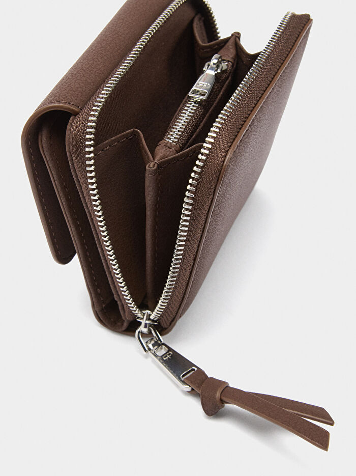 Dokulu ve çıtçıtlı kapaklı küçük cüzdan. Kartlar ve kağıt paralar için kart yuvaları. Fermuarlı bozuk para bölmesi.