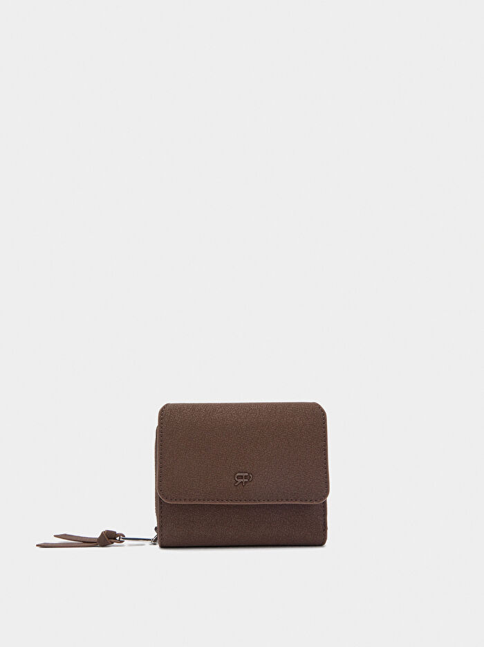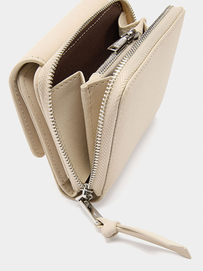 Dokulu ve çıtçıtlı kapaklı küçük cüzdan. Kartlar ve kağıt paralar için kart yuvaları. Fermuarlı bozuk para bölmesi.