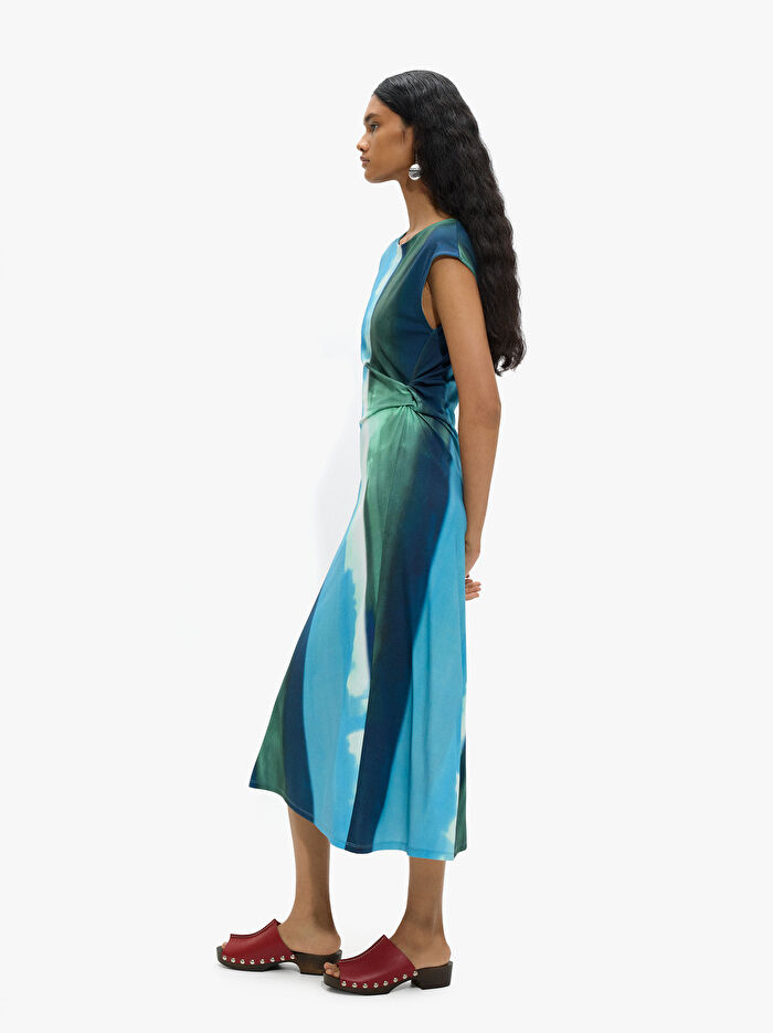 Suluboya efektli baskılı midi elbise. Tek tarafı drape detaylı. Kayık yaka. Kolsuz. Geniş etekli kesim. Model 1,78 m boyunda ve XS-S beden giyiyor.