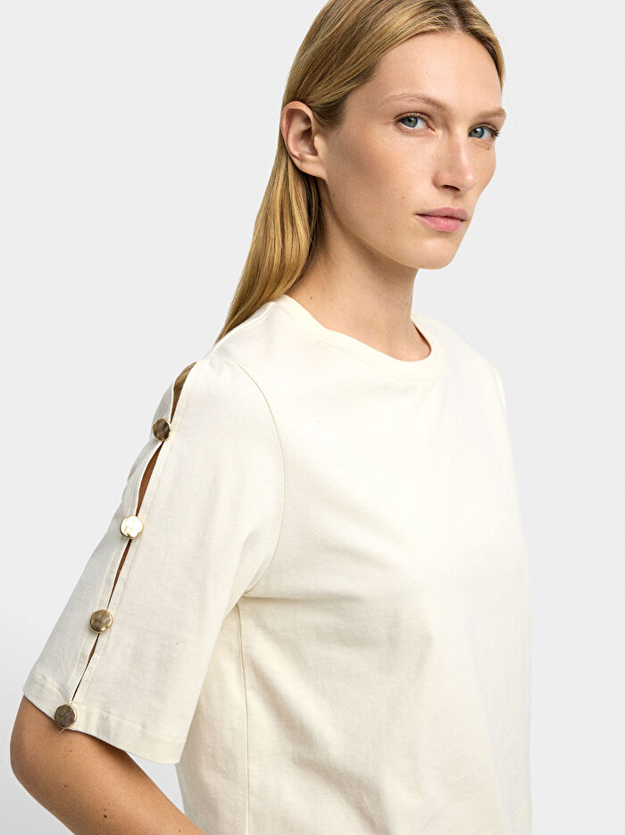 %100 pamuktan üretilmiş düz t-shirt. Yuvarlak yaka. Kesikli ve düğmeli detaylı kısa kol. Model 1,80 m boyunda ve S beden giyiyor.