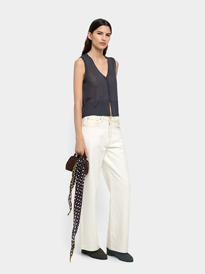 Düğmeli örgü yelek. Nervürlü kenarlar. V yakalı. Kolsuz. Model 1,78 m boyunda ve XS-S beden giyiyor.