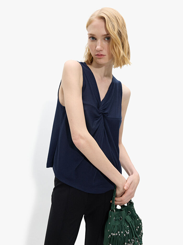 Düğüm detaylı nervürlü üst. V yakalı. Kolsuz. Model 1,78 m boyunda ve XS-S beden giyiyor.