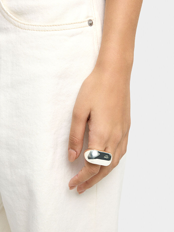 Yuvarlak kenarlı, düz, dikdörtgen şekilli maxi yüzük. Gümüş parlak kaplama.