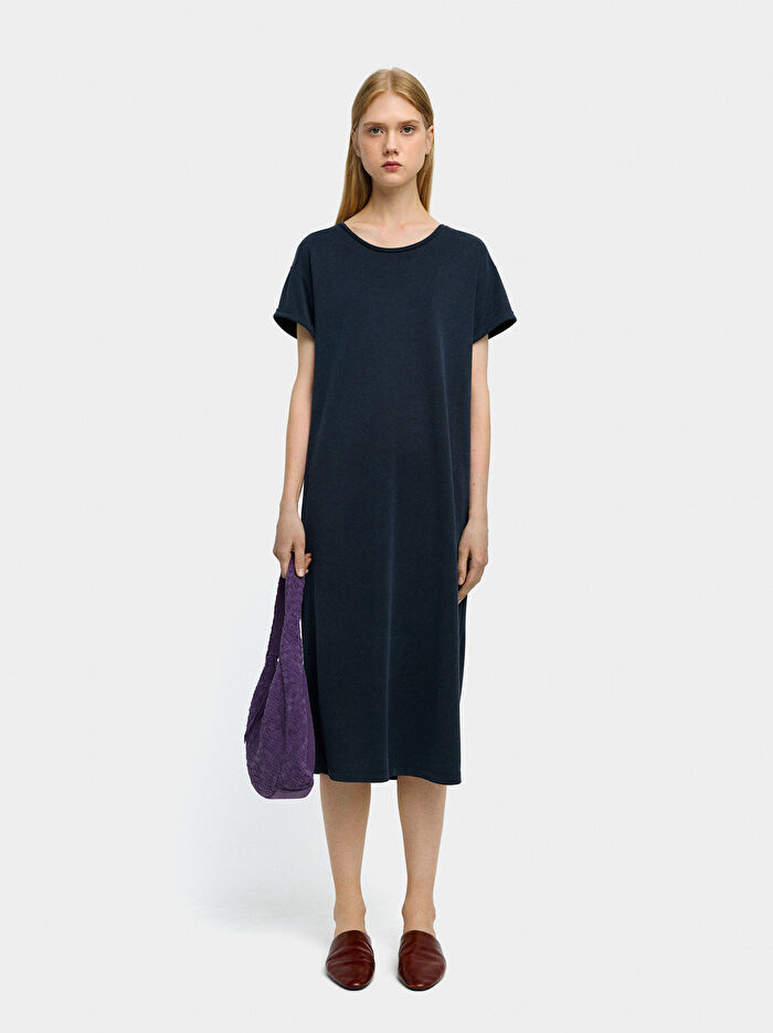 Yuvarlak yaka düz midi elbise. Manşetli kısa kollu. Düz kesim. Yanları yırtmaçlı. Model S beden giymektedir.
