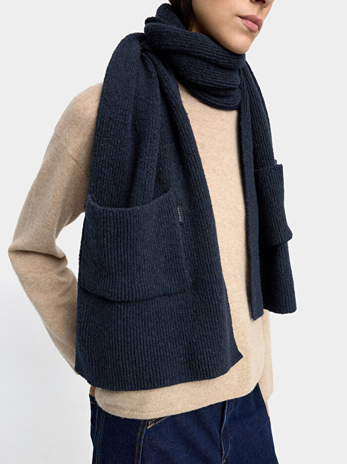 Düz nervürlü atkı, atkıyı bağlamak ve ayarlamak için bantlıdır. Soğuk günlerde sofistike, şık ve rahat bir görünüm elde etmek için idealdir.