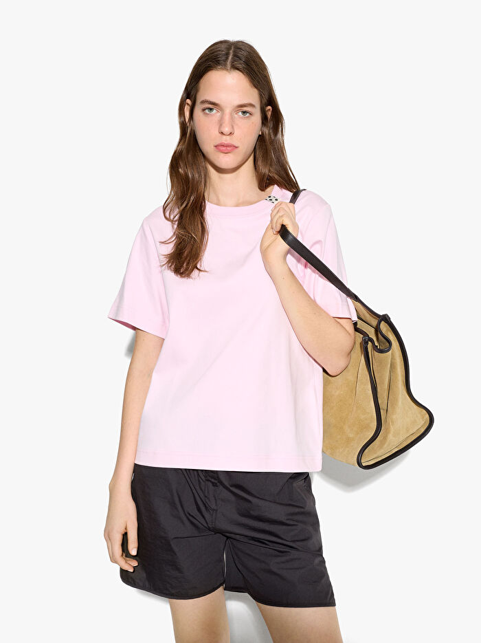 Düz pamuklu t-shirt. Baskılı detaylı yuvarlak yaka. Kısa kol. Model 1.75 m boyunda ve XS-S beden giymektedir.