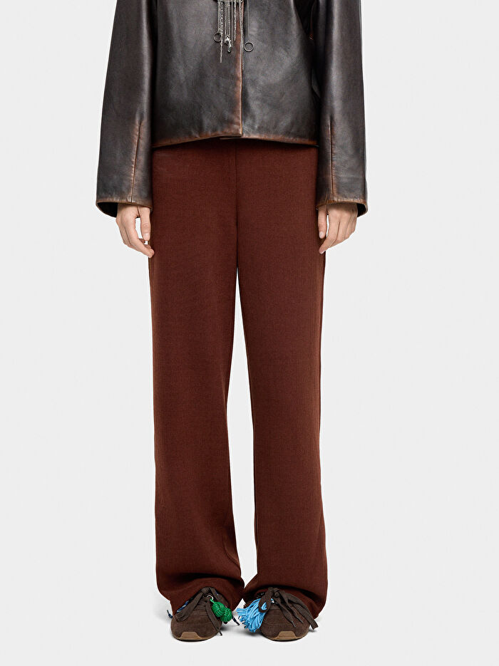 Düz, sade pantolon, elastik bel. Hafif nervürlü doku. Model 1,77 m boyunda ve XS-S beden giyiyor.