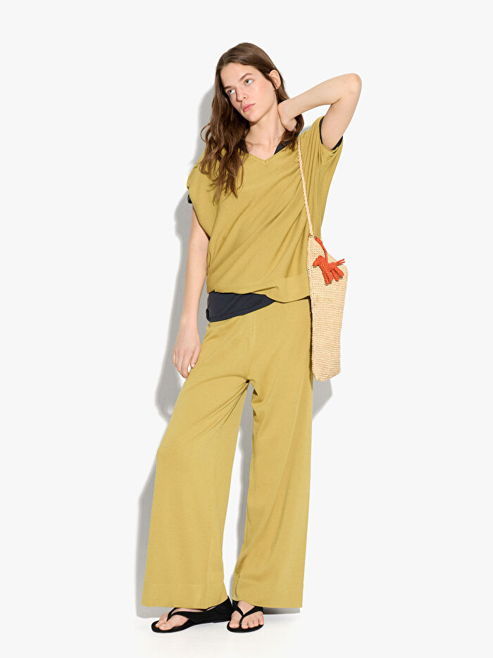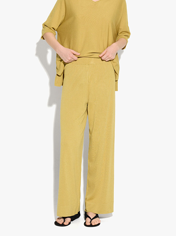 Elastik belli sade ve bol örgü pantolon. Belirgin etek ucu. Model 1.75 m boyunda ve XS-S beden giymektedir.