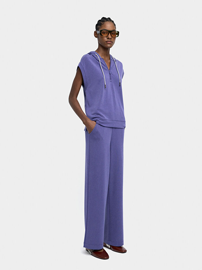 Elastik bel düz pantolon. Yan cepler. Model 1.80 m boyunda ve S beden giyiyor.