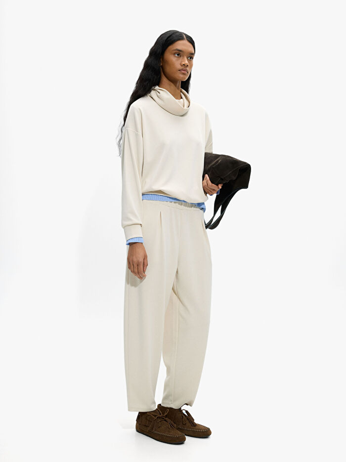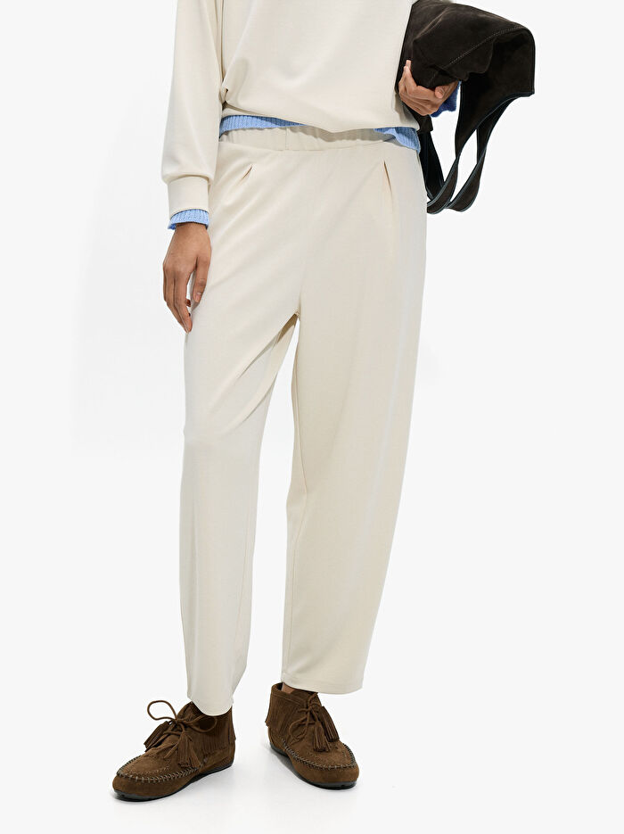 Ön kısmında pileli pantolon. Geniş paça kesim. Yan cepler. Lastikli bel. Model 1,77 m boyunda ve XS-S beden giyiyor.