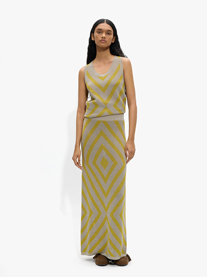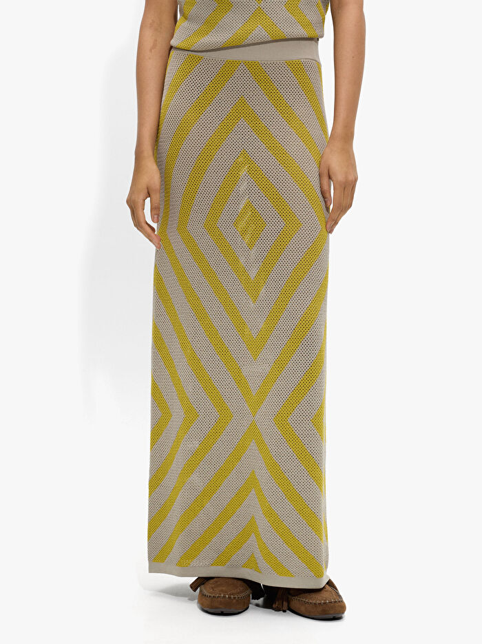 Geometrik baskı desenli uzun örgü etek. Belirgin kenarlar. Hafif A kesim. Elastik bel. Model 1.77 m boyunda ve XS-S beden giymektedir.