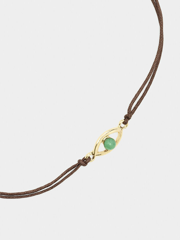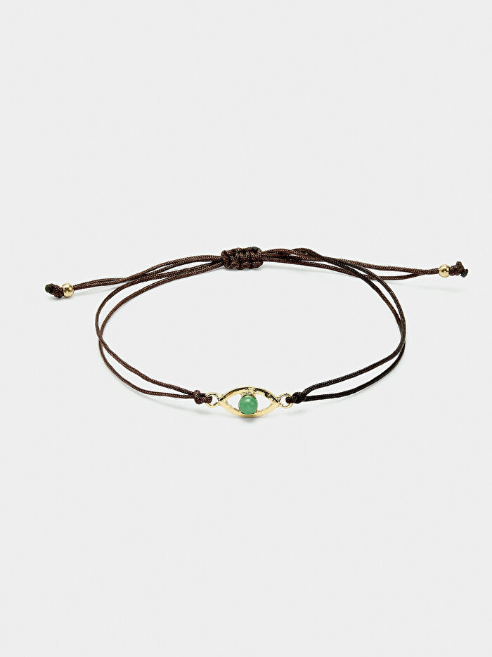 Göz aksesuarlı, ayarlanabilir ipli bileklik. Taş efektli küre detayı.