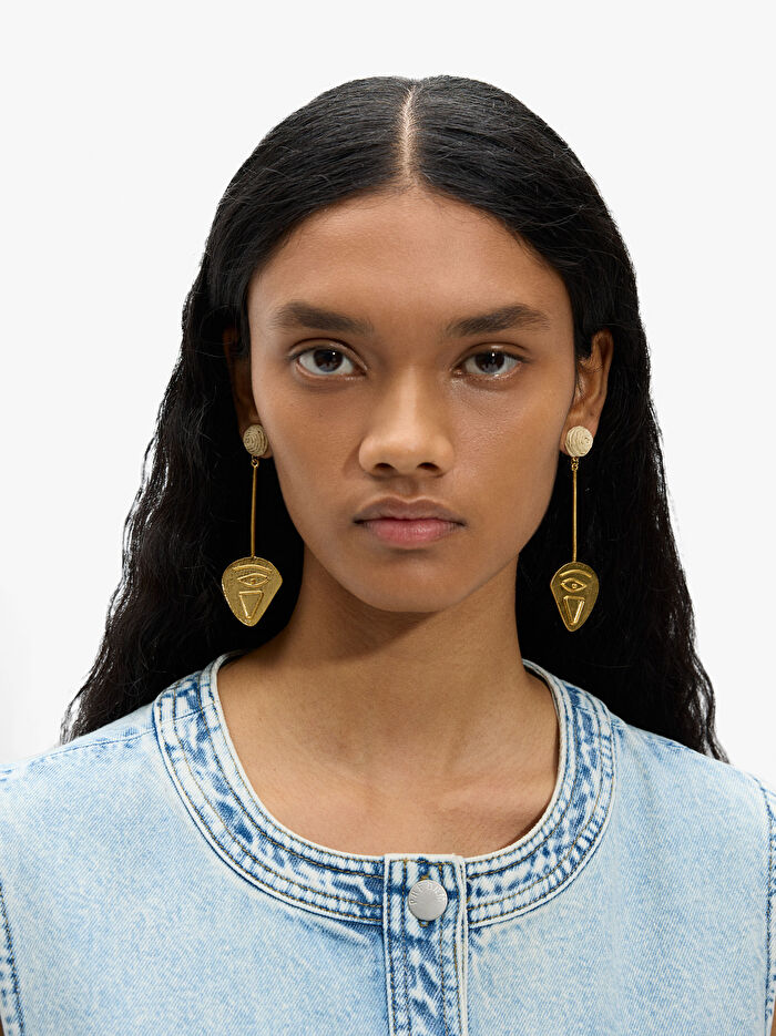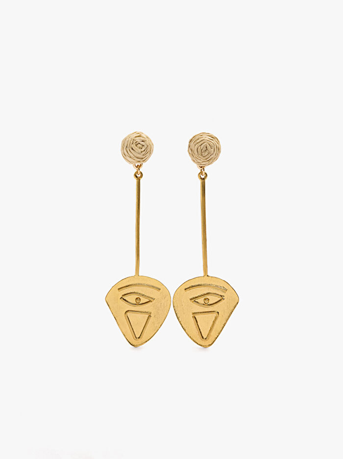 Çubuk pandantifli ve ucu göz desenli uzun küpe. Örgülü rafya efektli yuvarlak kabartmalı taban.
