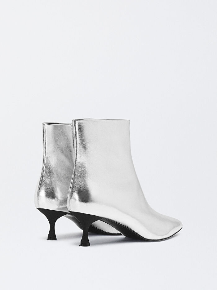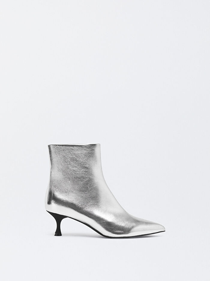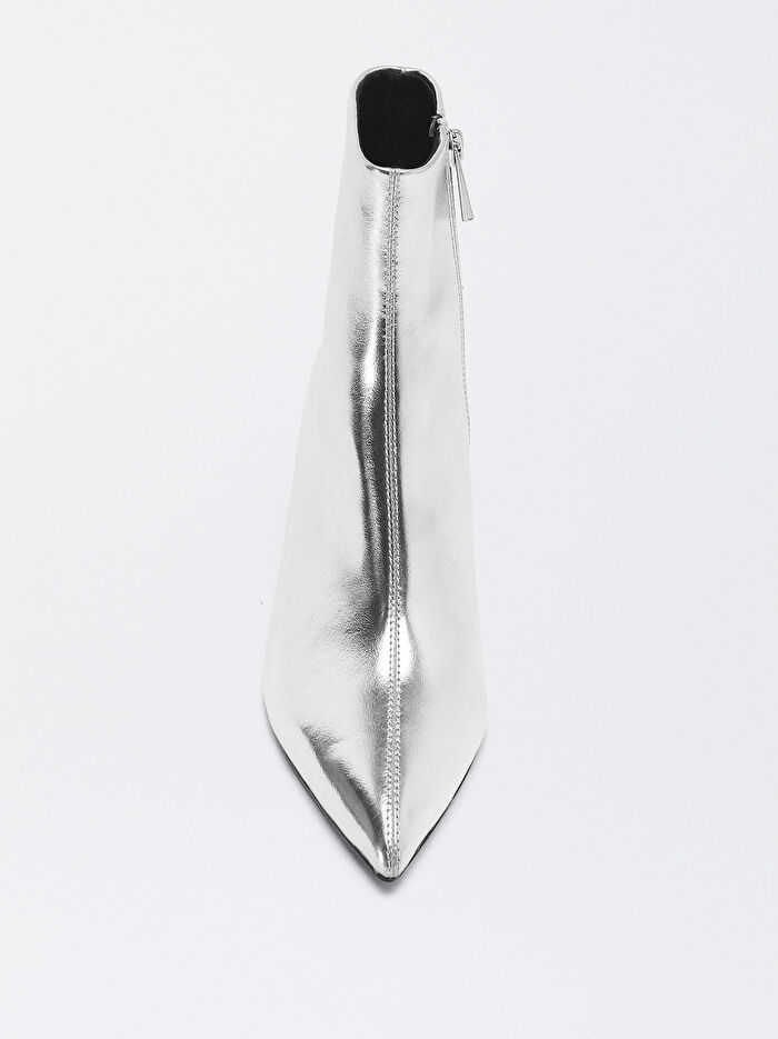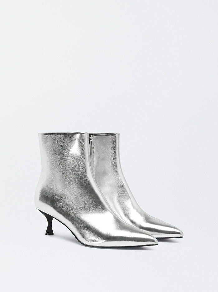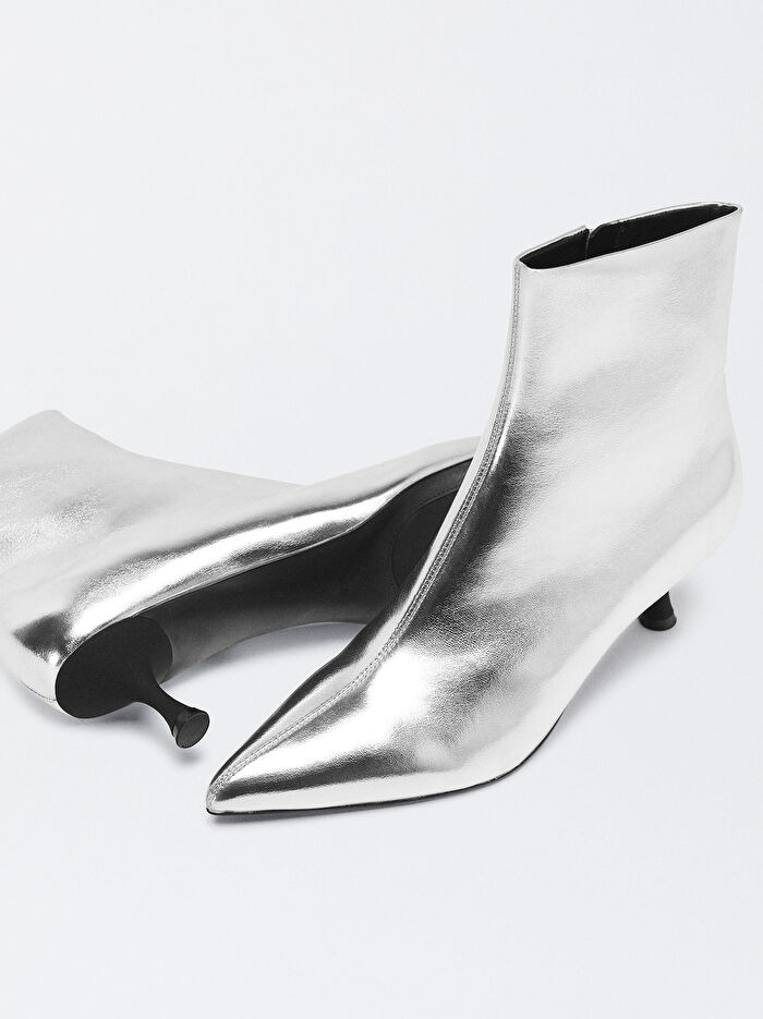 Sivri burunlu, ince topuklu, alçak metalik efektli bilekte bot. İç fermuarı ile uyumlu ön dikişli. Topuk yüksekliği: 5 cm.